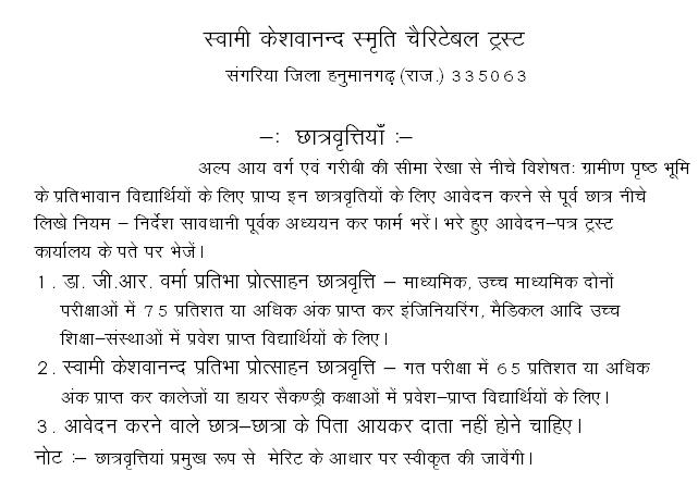 स्वामी केशवानन्द प्रतिभा प्रोत्साहन छात्रवृत्ति आवेदन-पत्र तथा डॉ. जी. आर. वर्मा प्रतिभा प्रोत्साहन छात्रवृत्ति प्रार्थना पत्र डाउनलोड करने के लिए क्लिक करें